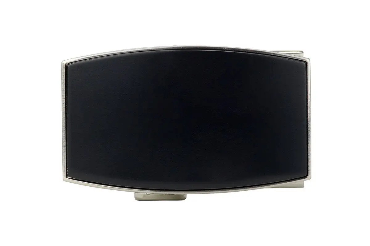 - Buckle has a brushed nickel finish frame with an anodized black face